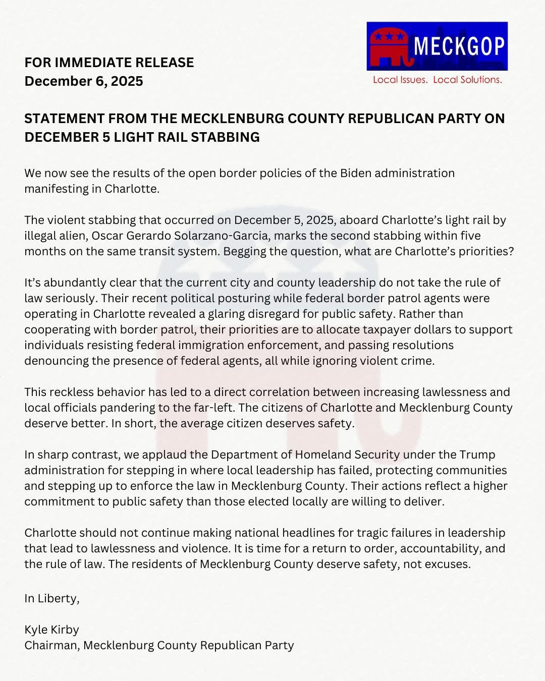 MeckGOP Statement on the December 5th Light Rail Stabbing